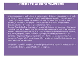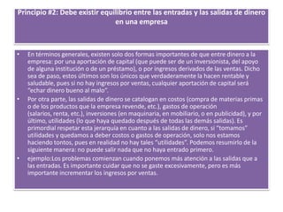 Este documento presenta 7 principios para una buena administración de empresas. Estos incluyen: 1) No extraer recursos más allá de la capacidad de la empresa para evitar dañar su crecimiento, 2) Mantener un equilibrio entre ingresos y egresos respetando la jerarquía de costos y gastos, y 3) Seguir la ley de siembra y cosecha invirtiendo en empleados, capacitación y proveedores para generar mayores ingresos.