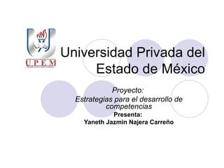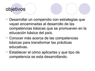 Este documento presenta un proyecto para desarrollar estrategias que promuevan las competencias básicas en la educación en México. Explica que las competencias incluyen conocimientos, habilidades, actitudes y valores que una persona adquiere a través del aprendizaje y aplica para resolver problemas. También describe que las competencias están relacionadas con aprender a conocer, aprender a hacer, aprender a vivir juntos y aprender a ser. El objetivo es ayudar a maestros a comprender y aplicar un enfoque basado en competencias.