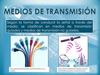 Este documento describe los diferentes tipos de medios de transmisión guiados y no guiados. Los medios guiados incluyen cable coaxial, par trenzado y fibra óptica, los cuales conducen señales a través de un cable. Los medios no guiados transmiten señales a través de ondas electromagnéticas mediante antenas y pueden clasificarse como radio, microondas e infrarrojos dependiendo de su rango de frecuencias.