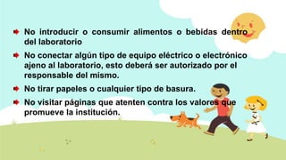 Este documento presenta las reglas y regulaciones para el uso del laboratorio de computación del centro. Los estudiantes no deben comer, beber o tirar basura dentro del laboratorio. Tampoco deben visitar sitios web inapropiados, dañar el equipo o alterar el software. Los estudiantes deben llegar puntualmente con los materiales necesarios y solo pueden usar el laboratorio durante sus horas de clase asignadas. El documento también describe las sanciones por violar las reglas, incluyendo amonestaciones verbales y escritas, suspensión temporal y