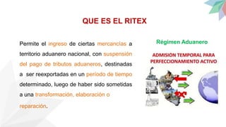 El documento describe el régimen de admisión temporal para el perfeccionamiento activo (RITEX) en Bolivia. RITEX permite el ingreso temporal de mercancías a Bolivia sin pagar tributos aduaneros para ser transformadas, elaboradas o reparadas y luego reexportadas. Las mercancías deben salir de Bolivia dentro de plazos determinados. El proceso incluye solicitar incorporación al RITEX, declarar la admisión temporal de mercancías, realizar las operaciones, exportar el producto resultante y cambiar el régimen a importación para consumo si corresponde