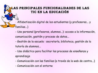 Las TIC tienen varias funcionalidades principales en la educación: 1) alfabetización digital de estudiantes, profesores y familias, 2) uso personal y gestión de la escuela, 3) uso didáctico que facilita la enseñanza y el aprendizaje. Ofrecen ventajas como la motivación de los estudiantes y la comunicación, pero también inconvenientes como la distracción y la dispersión.