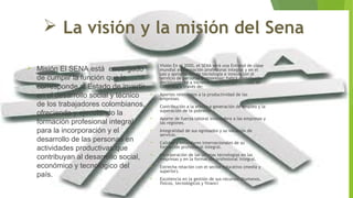 El documento describe la misión y visión del Servicio Nacional de Aprendizaje (SENA) de Colombia. La misión del SENA es ofrecer formación profesional integral para contribuir al desarrollo social, económico y tecnológico del país. Su visión para el 2020 es ser una entidad líder mundial en formación profesional e innovación al servicio de personas y empresas. El documento también resume los servicios que el SENA ofrece como bienestar a los aprendices.