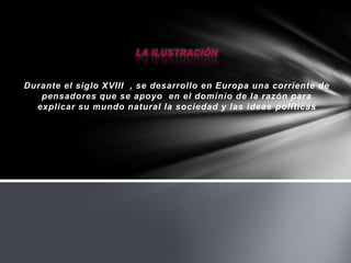 El documento trata sobre el pensamiento de la Ilustración en Europa durante el siglo XVIII. Los filósofos ilustrados se basaron en la razón para explicar el mundo natural, la sociedad y las ideas políticas. Algunos de los pensadores más importantes fueron Montesquieu, Voltaire y Rousseau. También se mencionan conceptos como el despotismo ilustrado y los déspotas ilustrados.