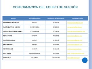El documento presenta la conformación del equipo de gestión de una institución educativa, incluyendo los nombres, roles, documentos de identificación y correos electrónicos de la rectora, coordinadores, docentes, padre de familia y estudiante. Además, contiene un diagnóstico institucional, misión, visión, propósitos, metas, direccionamiento estratégico y plan de acción para fortalecer el uso de las tecnologías de la información y comunicación en la institución.