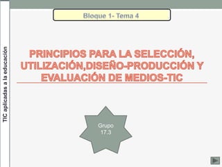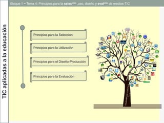 Este documento presenta los principios para la selección, uso, diseño y evaluación de medios TIC en educación. Explica que la selección de TIC debe considerar objetivos, contenidos, receptores y contexto. También describe las etapas de diseño, producción, posproducción y evaluación de medios, así como principios para la utilización de TIC centrados en el aprendizaje, el profesor y el estudiante.