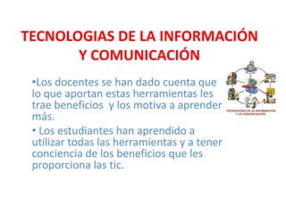 Este documento describe las tecnologías de la información y comunicación en la educación, la informática educativa y sus ventajas, así como las competencias docentes necesarias para el uso de las TIC. La informática educativa utiliza las herramientas informáticas como mediadoras del proceso educativo. El uso de las TIC brinda beneficios a docentes y estudiantes, permitiendo la interacción individualizada y ampliando las experiencias de aprendizaje. Las TIC pueden ayudar a los estudiantes a desarrollar competencias como el uso de tecnología