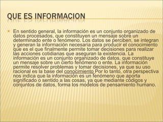 El documento provee una introducción general sobre la información, definiéndola como un conjunto organizado de datos procesados que constituyen un mensaje. Explica que los datos generan información que a su vez produce conocimiento para tomar decisiones. También describe las habilidades de información y su importancia para reconocer, acceder, evaluar, sintetizar y comunicar información de manera efectiva.