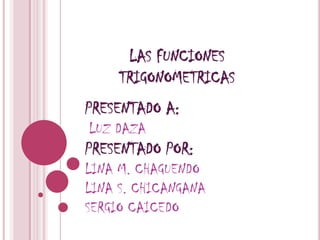 Este documento presenta las funciones trigonométricas básicas. Explica que la trigonometría estudia las funciones seno, coseno, tangente, cotangente, secante y cosecante. Define el seno como la razón entre el cateto opuesto e hipotenusa, el coseno como la razón entre el cateto adyacente e hipotenusa, y la tangente como la razón entre el cateto opuesto y el cateto adyacente. También introduce las funciones inversas como la cosecante, secante y cotangente.