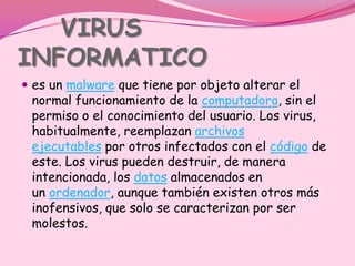 Este documento describe los virus informáticos, incluyendo su historia, características, métodos de propagación y protección. Los virus son programas maliciosos que infectan computadoras sin el permiso del usuario y pueden causar daños a los datos o interrupciones en los sistemas. El primer virus informático se desarrolló en 1971 y atacó una computadora IBM. Existen varios tipos de virus como caballos de Troya, gusanos y virus de macros.