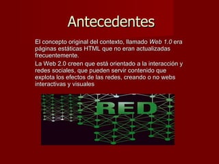 La Web 1.0 consistía en páginas HTML estáticas que no se actualizaban frecuentemente, mientras que la Web 2.0 se enfoca en la interacción y redes sociales para crear contenido dinámico. La Web 2.0 permite buscar, compartir e interactuar en línea de forma colaborativa. Representa la evolución hacia aplicaciones web centradas en el usuario que facilitan la colaboración y participación activa de las personas.