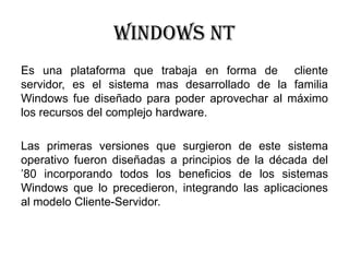 Windows NT es un sistema operativo de 32 bits diseñado para aprovechar al máximo los recursos del hardware mediante la arquitectura cliente-servidor. Ofrece multitarea, compatibilidad con múltiples procesadores e incluye características como recursos compartidos de archivos e impresoras. Requiere hardware de 32 bits como mínimo 16 MB de RAM y puede funcionar como sistema operativo distribuido mediante el uso de dominios.