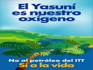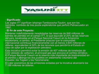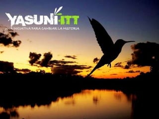 La iniciativa Yasuní-ITT propone mantener indefinidamente las reservas de petróleo en el campo ITT del Ecuador, equivalentes al 20% de las reservas del país, a cambio de una contribución de al menos $3,600 millones por parte de la comunidad internacional. Esto permitiría evitar la emisión de 407 millones de toneladas de CO2 y proteger la biodiversidad del Parque Nacional Yasuní, hogar de pueblos indígenas aislados.