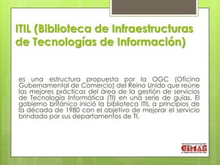 ITIL es una estructura propuesta por el gobierno británico que reúne las mejores prácticas de gestión de servicios TI. Tiene como objetivo mejorar la calidad de los servicios TI para aumentar la satisfacción del cliente. Se compone de nueve áreas que cubren todos los aspectos de la gestión de servicios TI.