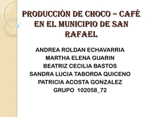 Este documento presenta un proyecto para crear una pequeña empresa productora de Choco-Café en el municipio de San Rafael, Antioquia. El proyecto busca generar empleo a través de la producción de un producto innovador y de fácil fabricación. Se realizaron estudios de mercado que muestran demanda por un producto saludable y de buen precio como el Choco-Café. El proyecto requiere una inversión inicial para adecuar el local e instalaciones y contratar 4 operarios. De implementarse, el proyecto