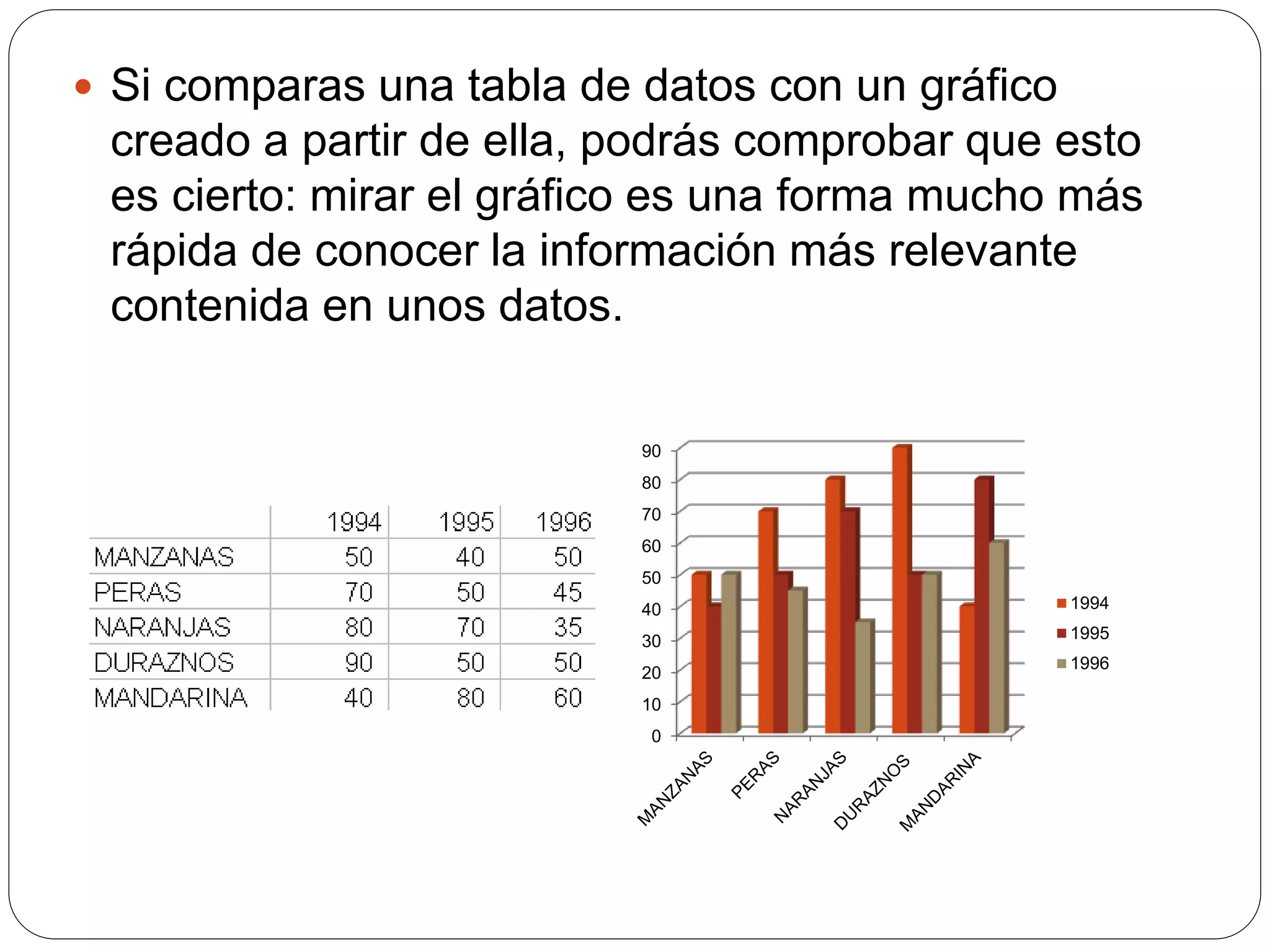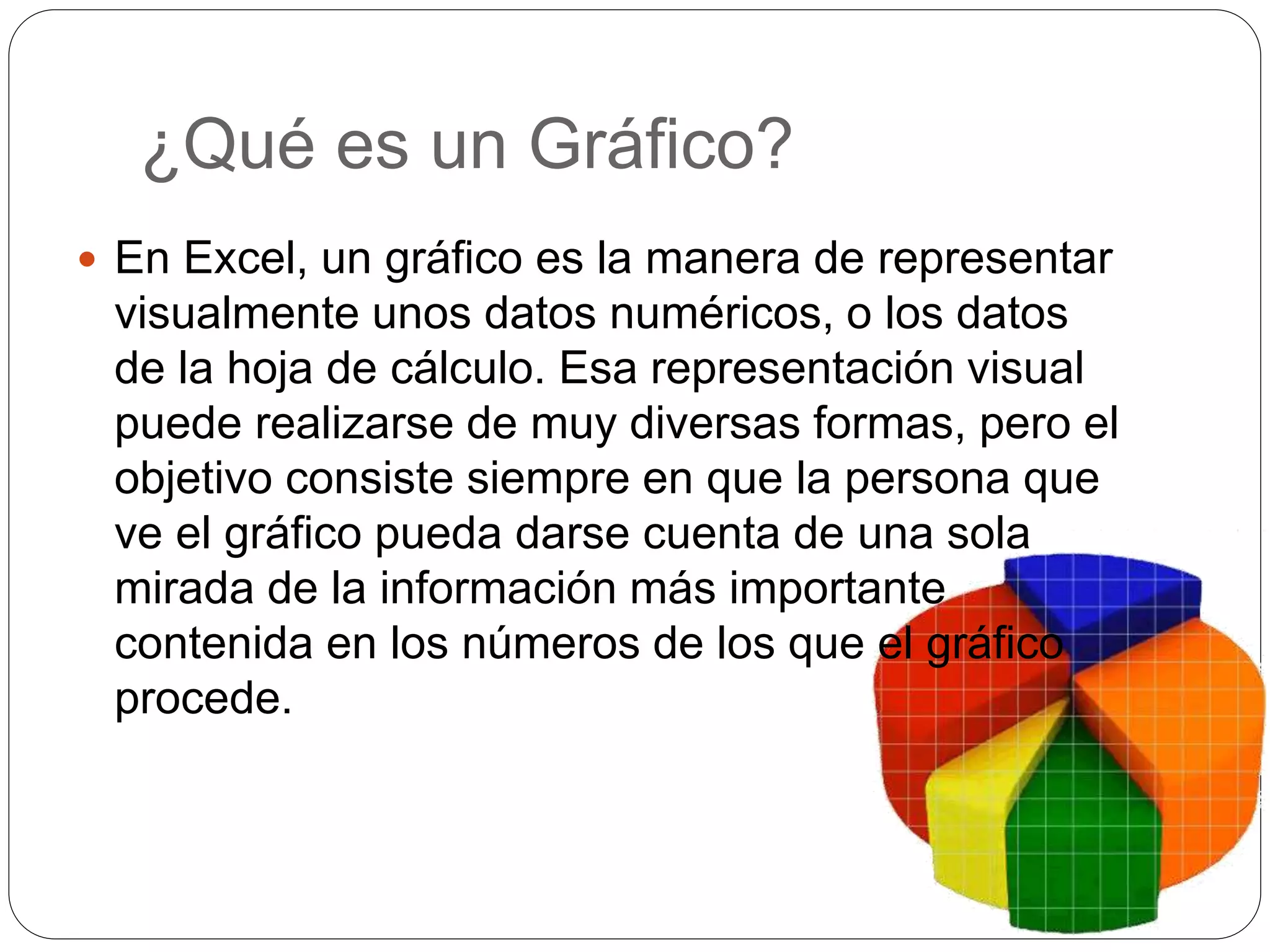 El documento explica qué son los gráficos en Excel y cómo crearlos. Define un gráfico como una representación visual de datos numéricos que permite ver información rápidamente. Explica que los gráficos vinculan automáticamente los datos y la hoja de cálculo, y que existen diferentes tipos como barras, columnas y circulares. También describe los pasos para crear un gráfico usando el asistente, incluyendo seleccionar datos, configurar opciones y agregar el gráfico a una hoja.