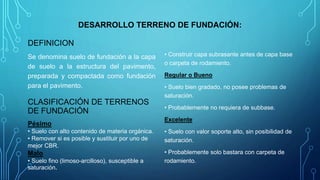 El documento resume los conceptos clave relacionados con la exploración y caracterización de suelos de fundación para proyectos de construcción. Define el suelo de fundación, explora métodos como calicatas y sondeos para determinar las propiedades de los suelos, y clasifica los suelos según su origen, composición y aptitud para su uso como fundación.
