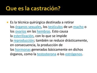 Este documento describe tres técnicas de castración en animales: la castración escrotal, la preescrotal y la química. La castración escrotal implica la extracción directa de los testículos a través de un corte en el escroto, mientras que la preescrotal extrae los testículos a través de un único acceso quirúrgico preservando el escroto. La castración química usa inyecciones para bloquear el paso de espermatozoides. Además, explica que la castración suprime comport