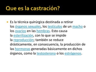 Este documento describe diferentes técnicas de castración en animales, incluyendo la castración quirúrgica que retira los órganos sexuales causando esterilización, métodos químicos como la vasectomía química, y las técnicas de castración preescrotal y escrotal. La castración suprime comportamientos no deseados en animales y reduce los niveles de estrés.