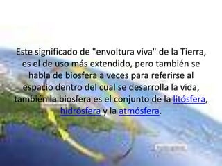 La biosfera es el sistema formado por todos los seres vivos en la Tierra y su medio ambiente, que incluye la litósfera, hidrósfera y atmósfera. La biosfera es el ecosistema global que resulta de la interacción de una gran variedad de organismos y especies, y tiene la capacidad de controlar su propia evolución dentro de ciertos límites.