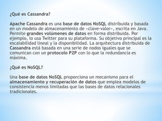 El documento proporciona información sobre Cassandra, una base de datos NoSQL distribuida y basada en un modelo de almacenamiento clave-valor. Explica cómo instalar y configurar Cassandra en Windows, incluida la edición de variables de entorno y archivos de configuración. También muestra ejemplos básicos de cómo crear una base de datos, tablas, e insertar y consultar datos usando el lenguaje de consulta CQL a través de la línea de comandos.