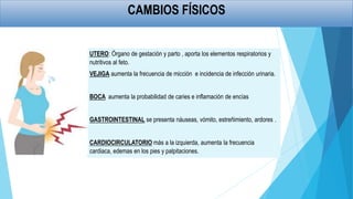 El documento describe los cambios físicos, psicológicos y emocionales que ocurren durante el embarazo, destacando las transformaciones en diversos sistemas del cuerpo de la madre. Además, se aborda la importancia del apoyo de la pareja y la familia en este proceso, así como las implicaciones legales en el ámbito laboral relacionadas con la protección de la trabajadora durante el embarazo y lactancia. Finalmente, se subraya que el acompañamiento y cuidado de la madre pueden reducir el estrés y la depresión posparto.