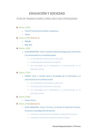 El documento presenta el plan de trabajo diario de un curso de pedagogía para el año 2014-2015. El plan incluye las fechas de las clases magistrales, vídeos y exposiciones de grupos sobre dos temas: el cambio social y las tecnologías de la información en la educación, y el papel del tutor y la familia en la educación primaria. El plan también detalla las tareas y fechas para la resolución de dudas.