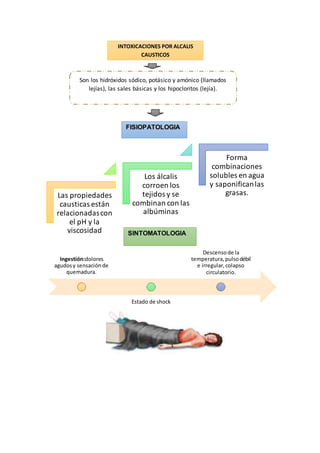 Este documento describe las propiedades y efectos de la intoxicación por hidróxido de sodio y hidróxido de potasio. El hidróxido de sodio, también conocido como sosa cáustica, es muy corrosivo con un pH superior a 11. Al entrar en contacto con la piel o los ojos puede causar quemaduras graves. La ingestión puede causar dolor agudo, shock y daño al esófago. El documento también proporciona métodos para reconocer el sodio y el potasio mediante reacciones químicas características