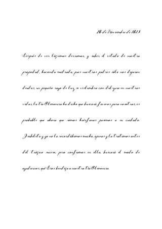 El documento es un diario que narra la vida de dos huérfanas tras la muerte de sus padres debido a una epidemia y su posterior ingreso al convento de Santa Clara. Refleja sus luchas emocionales, su deseo de aprender, y sus aspiraciones literarias, así como su anhelo por el amor y la amistad. A medida que avanza, la escritura en el diario se convierte en un medio para expresar sus sentimientos y pensamientos sobre el amor y el arte.