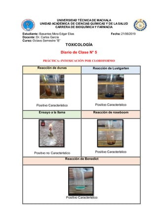 Este documento presenta los resultados de una práctica de laboratorio sobre intoxicación por cloroformo. Los estudiantes realizaron varias pruebas de reconocimiento como la reacción de Lustgarten, la reacción de roseboom y la reacción de Benedict, obteniendo resultados positivos característicos en todas ellas. También se describen las propiedades, usos y efectos tóxicos del cloroformo, así como las reacciones de reconocimiento de la acetonas.