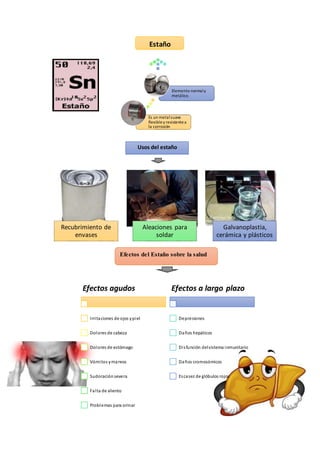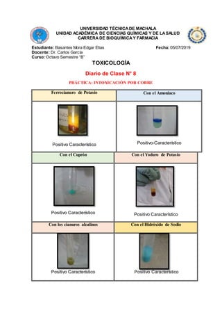 Este documento presenta los resultados de una práctica de laboratorio sobre intoxicación por cobre. Se muestran las reacciones de reconocimiento realizadas con diferentes reactivos como ferrocianuro de potasio, cuprón, yoduro de potasio y cianuros alcalinos, todos los cuales dieron resultados positivos característicos para cobre. También incluye información sobre estaño, plata y sus efectos sobre la salud y el medio ambiente, así como reacciones de reconocimiento para cada elemento.