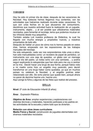Este documento presenta un resumen de las actividades realizadas en una clase de didáctica de educación infantil. Los estudiantes comparten sus experiencias de las vacaciones y realizan manualidades con materiales reciclados. Más adelante, debaten sobre una sesión de evaluación para mejorar la clase y continúan trabajando en proyectos educativos que fomentan el reciclaje. Finalmente, empiezan a planificar una unidad didáctica sobre alimentación para sus futuros alumnos.