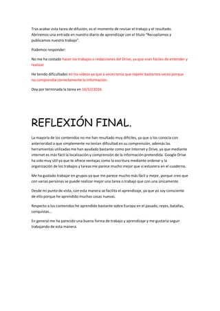 Este documento resume las reflexiones de un estudiante sobre una tarea de aprendizaje sobre la historia. El estudiante considera que es importante comunicar los eventos históricos para entender el pasado y cómo afecta el presente. Internet es el mejor medio para divulgar la historia. Aunque algunos videos fueron difíciles de entender, en general la tarea no fue difícil y las herramientas como Google Drive facilitaron la organización y el trabajo en grupo mejoró el aprendizaje.