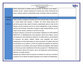 El documento describe las actividades de un día normal en la Telesecundaria Huaxtho #15 desde la llegada de los estudiantes hasta el final de las clases. Se detalla la realización de los honores a la bandera por la mañana y las diferentes materias impartidas durante el día, incluyendo ciencias naturales, español, matemáticas, historia y formación cívica y ética. El estudiante normalista observa y practica la enseñanza en varias de estas materias bajo la supervisión de los maestros.