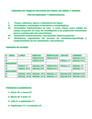 El documento presenta un diario de campo pedagógico de las áreas de ciencias sociales, económicas y políticas para los grados 9°, 10° y 11° en una institución educativa rural en Colombia. Incluye el esquema de trabajo aplicado, con temas, logros, actividades y estrategias metodológicas, así como la evaluación del proceso. También presenta el horario de clases y períodos académicos, y describe actividades institucionales y las temáticas abordadas en cada grado para cada periodo, con sus respectivos