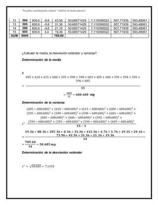 Este documento presenta los resultados de un análisis de calidad de 15 tabletas de ibuprofeno de 600 mg. Se midió el peso de cada tableta y se calculó la media, varianza y desviación estándar. La media fue de 600.6 mg y los límites superior e inferior fueron 607.71939 mg y 593.48061 mg respectivamente. Se concluyó que las tabletas 2, 3, 6 y 11 estaban por fuera de los límites permitidos y no pasaron el control de calidad.