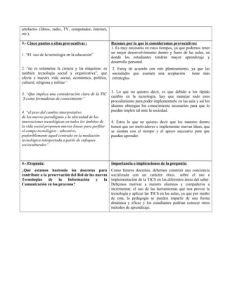 El documento discute el rol de las tecnologías de la información y la comunicación en los procesos educativos en la República Dominicana. Argumenta que las TIC han mejorado la práctica pedagógica y han ayudado a democratizar y lograr la equidad en la educación. También señala que los docentes deben estar dispuestos a utilizar nuevas herramientas tecnológicas para mejorar la enseñanza y el aprendizaje, y que las TIC pueden ser un recurso valioso para la educación si se usan