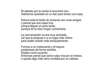 La mujer describe una cita extraña con su pareja en la que él se mostró distante y ausente, lo que la llevó a pensar que podría dejarla o estar interesado en otra mujer. Más tarde tuvieron relaciones sexuales aunque él siguió actuando de forma distraída. Ella pasó la noche llorando sin poder hablar con él porque se quedó dormido.