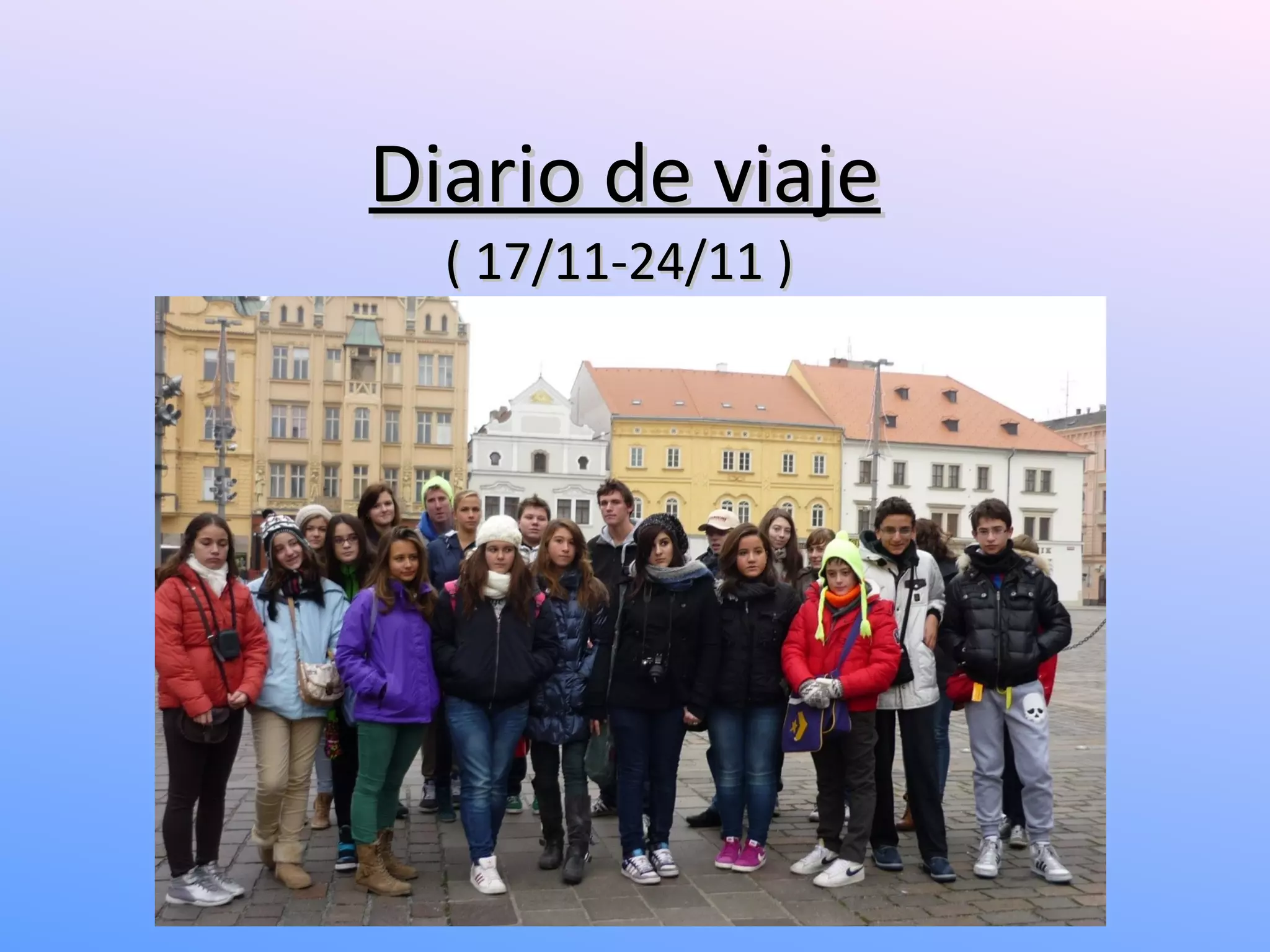 El diario de viaje describe las actividades de un estudiante checo y sus amigos italianos y españoles durante una semana de intercambio. Visitaron varias ciudades checas como Praga, Pilsen y Cesky Krumlov, donde vieron monumentos históricos, museos, cervecerías y castillos. También pasaron tiempo en el instituto, centros comerciales y cines, y se despidieron de los estudiantes españoles en el aeropuerto al final de la semana.