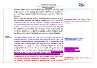 El resumen describe un día de observación de una estudiante normalista en una telesecundaria. La estudiante observó varias clases, incluyendo ciencias, español, matemáticas y formación cívica. Notó que los maestros usaban diferentes estrategias como zumba, debates y proyectos. También observó desafíos como falta de tareas y disciplina.
