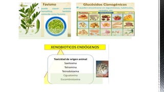 Este documento trata sobre la toxicología alimentaria. Explica que esta rama de la toxicología estudia los tóxicos que provienen de los alimentos, los cuales pueden ser endógenos o naturales del alimento, o exógenos o ajenos al alimento como compuestos añadidos o contaminantes ambientales. También resume las dos etapas de la evaluación toxicológica: identificación del tóxico y análisis de su toxicidad aguda, toxicocinética, toxicidad a corto, medio y largo plazo a trav