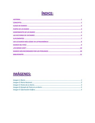 Este documento describe la historia, concepto y componentes básicos de los diarios. Explica que un diario es una publicación periódica que informa sobre los acontecimientos del día de manera objetiva. Luego detalla las diferentes partes de un diario como las secciones, los suplementos y los principales diarios en Latinoamérica. Finalmente, menciona algunos de los diarios más recordados en el Perú.