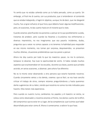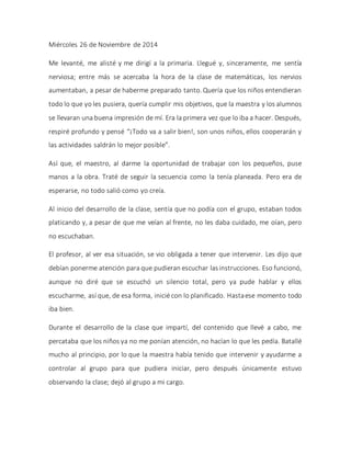 La estudiante realizó su práctica docente impartiendo clases de matemáticas y formación cívica a niños de primaria. Tuvo dificultades para controlar a los estudiantes al inicio, pero con la ayuda del maestro logró captar su atención. Aunque se sintió agotada, los productos de los estudiantes mostraron que habían alcanzado los objetivos. La maestra le ofreció comentarios y sugerencias positivas. La estudiante disfrutó la experiencia a pesar de los retos y se sint