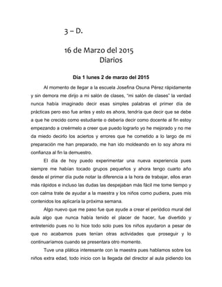 Este documento presenta los diarios de prácticas escolares de un estudiante de maestro durante 9 días. El estudiante ayudó a la maestra en el salón, enseñó lecciones sobre vacunación y geografía, y resolvió conflictos entre estudiantes. Aunque tuvo dificultades con la disciplina al principio, mejoró en manejar el salón y desarrolló una mejor comprensión de ser maestro a través de esta experiencia práctica.