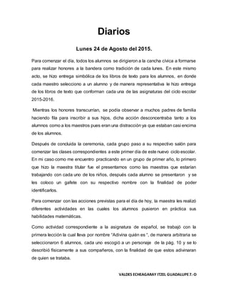 El documento describe las actividades realizadas en un salón de primer grado durante la primera semana de clases. Cada día, los estudiantes participaron en varias actividades de español y matemáticas centradas en el reconocimiento de letras, sonidos, números y conceptos básicos. También se mencionan detalles como la bienvenida a nuevos estudiantes y una prueba diagnóstica realizada al final de la semana.