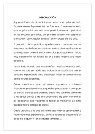 Este documento describe la experiencia de práctica docente de una estudiante de licenciatura en una escuela primaria. Describe las características de la escuela y los estudiantes, su papel como maestra practicante, los logros obtenidos y las limitaciones encontradas. La autora busca mejorar su práctica docente aplicando estrategias innovadoras y adecuadas para cada estudiante.
