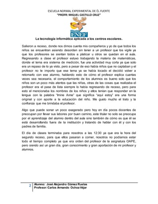 Este documento describe las observaciones de un estudiante en una escuela primaria durante varios días. Describe las lecciones y actividades de clase, así como las interacciones entre maestros, estudiantes y el observador. El estudiante nota tanto aspectos positivos como negativos en la enseñanza y el comportamiento de los estudiantes, y tiene la oportunidad de enseñar una lección él mismo.