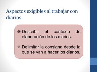 Este documento presenta seis tipos de diarios de profesores y analiza sus características. Los diarios varían en su estructura y enfoque, desde diarios muy estructurados que describen tareas, hasta diarios centrados en las personas. Todos los diarios enfrentan dilemas como equilibrar la planificación con la espontaneidad o individualización versus trabajo en grupo.