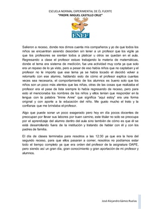 El documento describe 6 días de observación de un estudiante en una escuela primaria. Describe las actividades diarias de los maestros y alumnos, incluyendo lecciones sobre español, matemáticas y educación física. También discute algunos desafíos como la falta de disciplina de los alumnos y problemas familiares que afectan su aprendizaje. El estudiante realizó algunas lecciones y actividades y recibió comentarios positivos del maestro titular sobre su potencial como maestro.