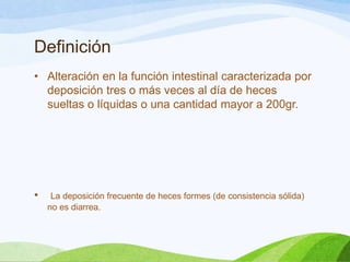 La diarrea se define como deposiciones tres o más veces al día o más de 200 gramos de heces sueltas o líquidas. Se clasifica en aguda, persistente y crónica dependiendo de su duración. Las causas más comunes de diarrea aguda son infecciones virales o bacterianas como E. coli, Salmonella, Shigella o parásitos como Giardia. El tratamiento consiste en rehidratación y alivio de síntomas dependiendo de la causa subyacente.